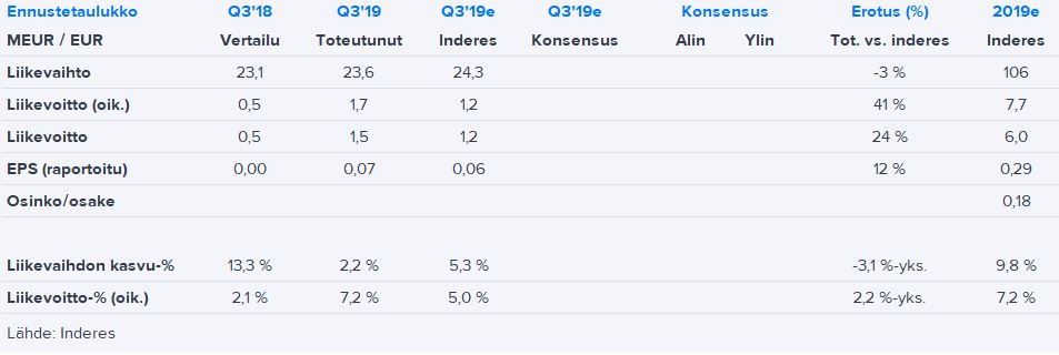 Exel julkaisi hetki sitten Q3-raporttinsa. Liikevaihto jäi pari napsua odotuksistamme, mutta kannattavuus ylitti ennusteemme selvästi. Kannattavuuskäänne jatkoi näin ollen mallikkaasti oikeansuuntaista etenemistään. Kuluvan vuoden ohjeistuksensa yhtiö toisti. Yksittäisistä asiakassegmenteistä Rakentaminen ja Infrastruktuuri oli tuulivoiman vetämänä odotetusti vahvin, kun taas Teollisissa sovelluksissa volyymeja painoi yhä telekommunikaatiosektroin pehmeys.