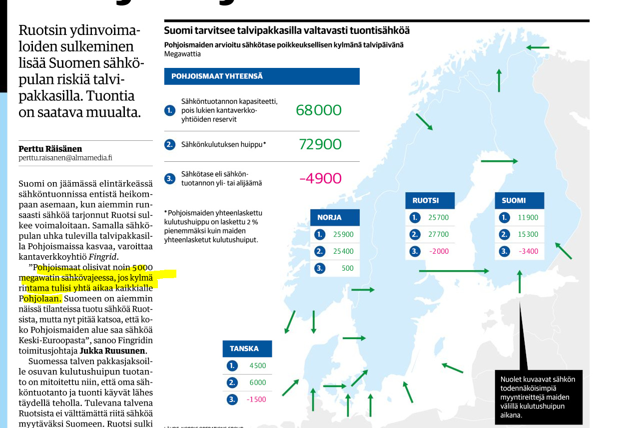 No ei ihan hukuta. Noin 5000MW puuttuu, ja suomessa tarkoittaa sitä että pakkaspäivä + häiriö tuontiyhteyksissä = sähkön hinta 1000e+/MW(?), minkä lisäksi Massen mökistä katkeaa välillä sähköt kun sitä säännöstellään huoltovarmuuden kannalta kriittisiin kohteisiin ![]()