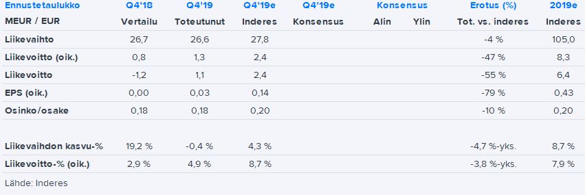 Exel julkaisi hetki sitten Q4-raporttinsa. Yhtiö jäi kaikilla operatiivisilla riveillä varsin selvästi ennusteistamme ja Q4:stä tuli lopulta tuloksellisesti vuoden heikoin neljännes. Ohjeistus oli odotetun kaltainen. Osinkoehdotus oli hieman odotuksiamme matalampi, mutta tähän ei yhtiön käynnissä olevat kehityshankkeet ja tavoitetason yläpuolella oleva velkantuneisuus huomioiden liity dramatiikkaa.