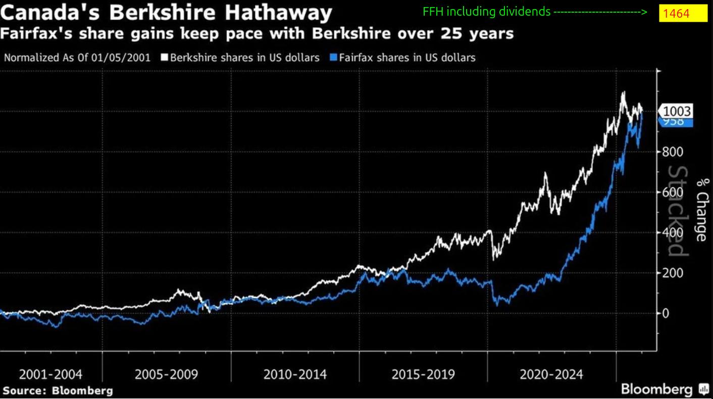 Pelkkien osinkojen muodostama tuotto ajanjaksolla oli 52,8%. Jos osingot olisi voinut sijoittaa takaisin verottomasti, Fairfaxin tuotto olisi näin laskien 1464%. Jos osingoista olisi pitänyt maksaa esimerkiksi tyypillinen 25,5% vero, jää tuotto noin 1310%:iin, mutta hakkaa silti Berkshiren tuoton (1003%).