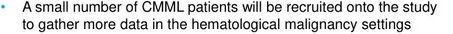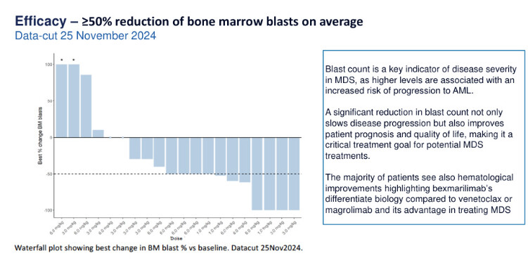 Ohjeessa sanotaan, että blastien vähentäminen ennen kantasolusiirtoa 5 %:iin tai alle (siten CR ja mCR) on erityisen tärkeää niille, jotka saavat vain kevyen hoidon ennen siirtoa eli kuten BEXMABin vanhat sairaat ihmiset. Se estää taudin uusiutumista. Siirtoa kannattaa kuitenkin yrittää isommallakin blastimäärällä (PR).
