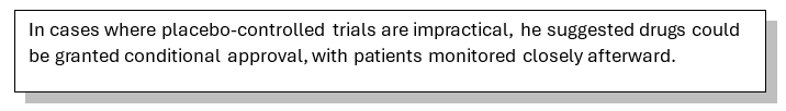 If there is an investigational drug, Makary explained, “that makes sense physiologically. The mechanism is scientifically plausible that this treatment would help these individuals.” The FDA could approve that therapy on “a conditional basis . . . even though we don’t have a randomized controlled trial because it’s not feasible.”