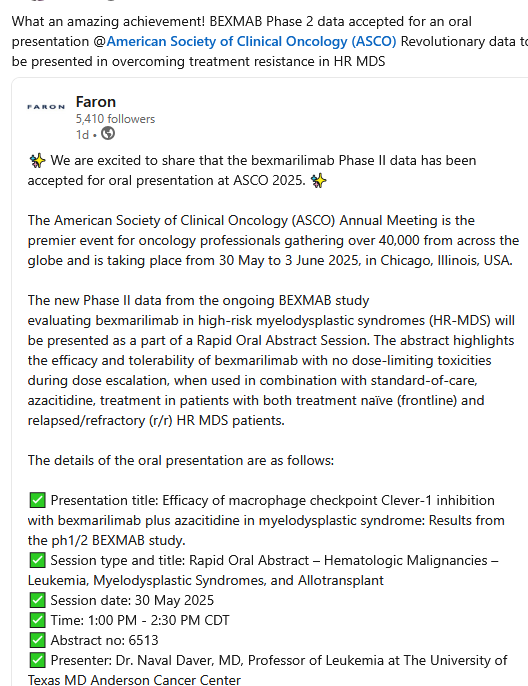 Suulliseen esitykseen valittu abstrakti korostaa bexmarilimabin, Faronin uuden humanisoidun anti-Clever-1-vasta-aineen, tehoa ja siedettävyyttä ilman annosta rajoittavia toksisuuksia annoksen suurentamisen aikana, kun sitä käytetään yhdessä standardihoidon, atsatsitidiinin, kanssa sekä hoitamattomilla (ensilinjan) että uusiutuneilla/refraktaarisilla (r/r) HR MDS -potilailla.