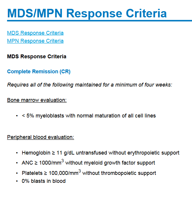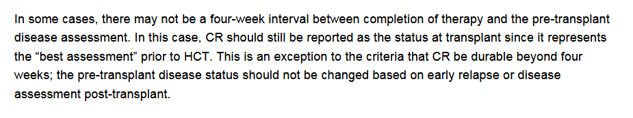 Eli käytännössä siirteen saavien potilaiden CR-vasteen ei tarvitse kestää näytteenottohetkeä pidempään, että heidät raportoidaan CR potilaina. Muuten vasteen tulisi kestää kaikkien kriteerien osalta vähintäinkin 4 viikkoa. Siirteen saaneita potilaita oli tuossa 7 CR-potilaan joukossa 5. joten tällä selittynee suuri osa näistä “uskomattomista” vasteista mTP53-potilailla.