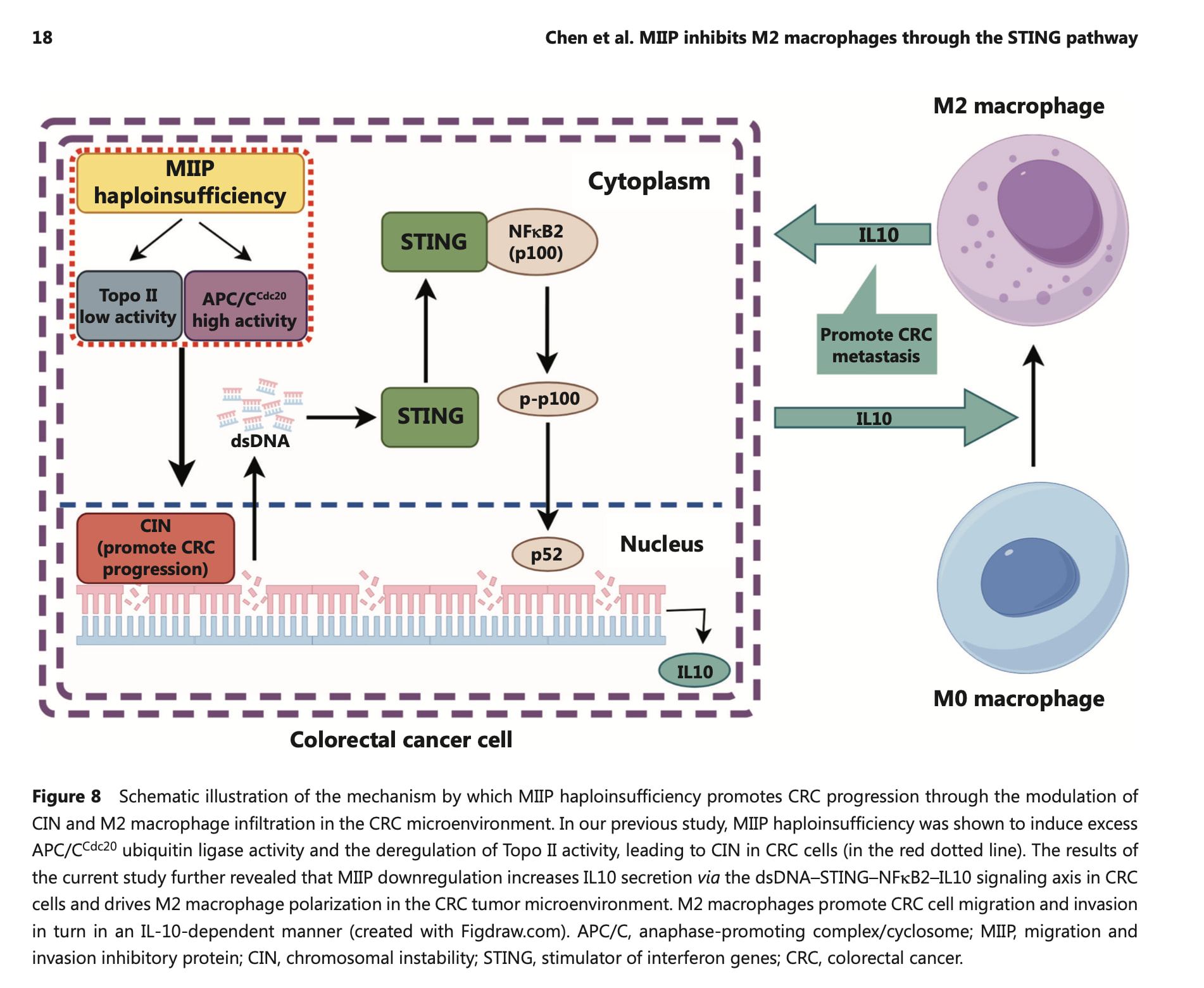In this CRC paper, STING directs macrophages to an M2 state via IL-10, which keeps the immune brake on. This is shown from cell models to mice, and even in data from 400 patients.