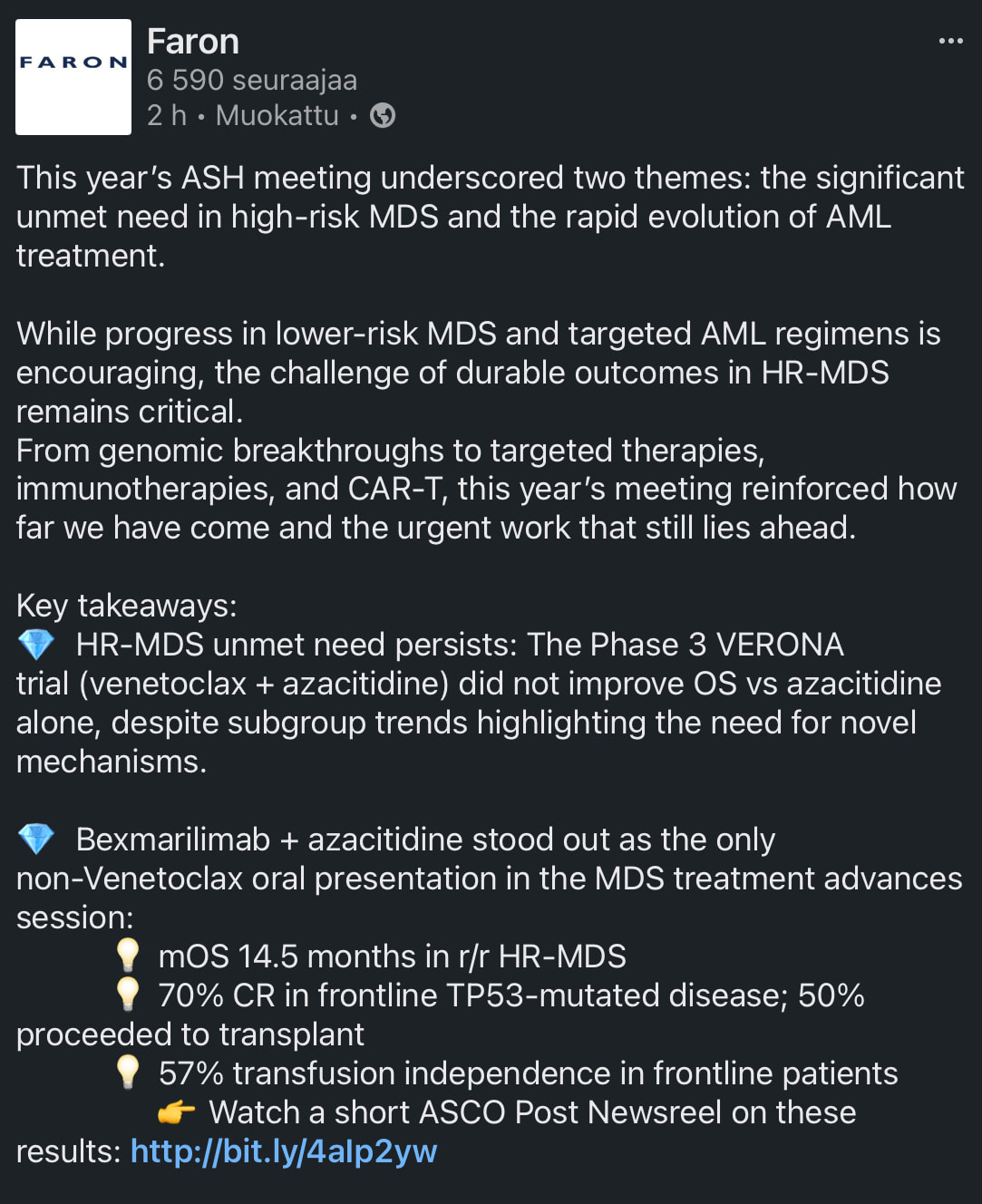 Tästähän meillä ei ole tietoa, mutta onko sillä sinänsä merkitystä? Mikäli lääkekehittäjän osuus myynnistä on sama riippumatta taudinkuvasta, niin eikö sinänsä olisi järkevää tehdä diili kaikkien indikaatioiden osalta, kunhan näiden tutkimukseen lohkeaa riittävästi rahaa. Tuntuisi hassulta että kiinteiden kasvaimien sopimukset hierottaisiin erikseen tai että myyntihinta/palkkio olisi eri. Toki mikäli partneroituminen tapahtuisi vain mds osalta niin miten muiden kasvaiden trialit rahoitettaisiin? Jos näistä lääkkeeksi päädyttäiisiin niin myytäisiinkö oikeudet eri lääkeyhtiölle? Pohdinta on tyystin omaani, mutta uskoisin että Faron toivoisi partneria koko sopalle, mutta haluaako lääkeyhtiö ottaa suurempaa riskiä ilman tutkimustuloksia muiden syöpien osalta?