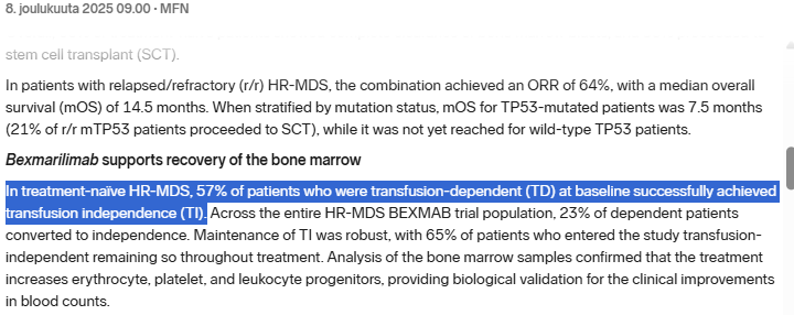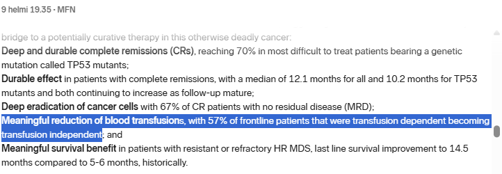 Nyt tiedotteessa: " Meaningful reduction of blood transfusions, with 57% of frontline patients that were transfusion dependent becoming transfusion independent; and"