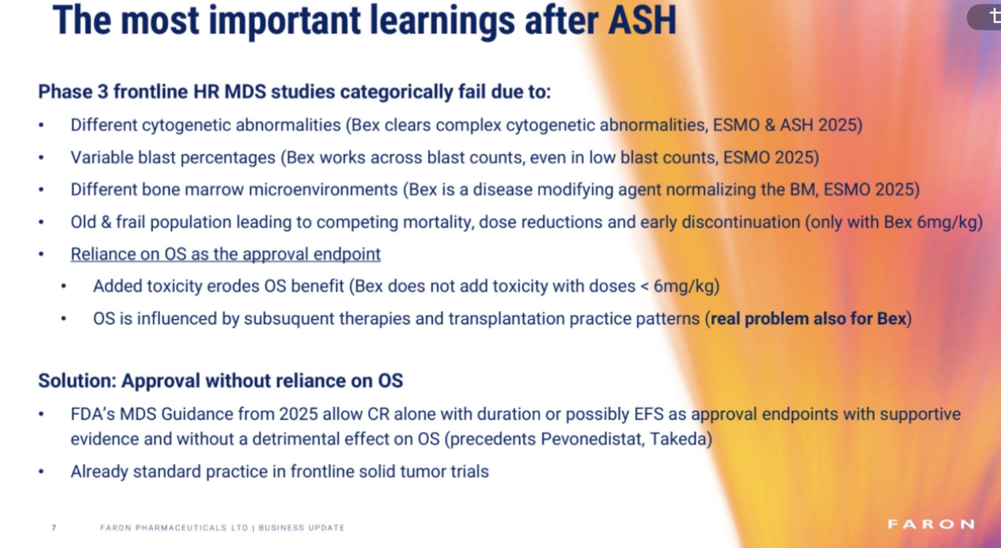 As Faron continues to advance its frontline development plan and addressing the FDA’s remaining question on contribution of each agent testing bexmarilimab + azacitidine against placebo + azacitidine, investigators from the BEXMAB Phase I/II trial believe that the benefit of bexmarilimab in r/r MDS is clear given the data produced to date in the BEXMAB trial. Hence, led by City of Hope (USA) an investigator-initiated trial (IIT) in r/r MDS is also planned to commence in 2026 to produce more data in the last line setting while Faron pursues the frontline setting. This IIT data in r/r MDS is planned to be used for further validation of the benefit of bexmarilimab in last line HR MDS and support the discussion by Faron of potential accelerated approval in r/r MDS with the FDA at the time of the frontline Phase II read out.