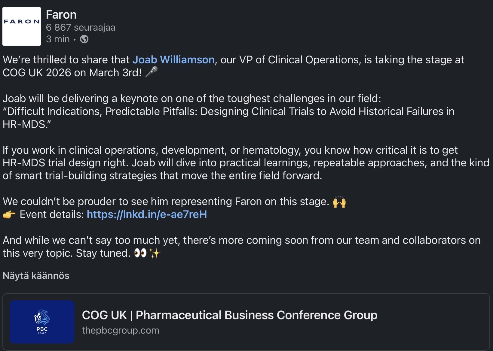 Jos tuote on kunnossa ja se nähdään potentiaalisena, niin täältä Helsingin pörssistä ne kyllä ostetaan pois kuljeksimasta. Onko Faronin tuote kunnossa, minä en osaa sitä sanoa. Mutta jotain kertoo se, että markkina-arvo on tällainen ja mikään iso lääkeyhtiö ei tee ostotarjousta. Eikö tämän pitäisi sijoittajille kertoa jo paljon?