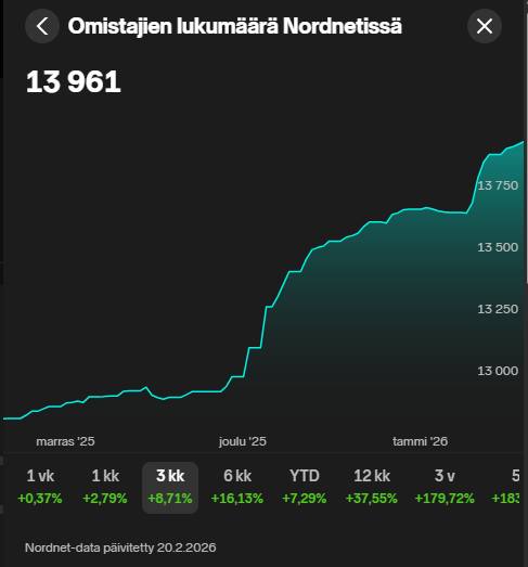 ValkoinenPeuras samtal till Euroclear i torsdags visade ägarlistans situation vid stängning måndagen den 16.2.2026. Vid den tidpunkten fanns inga tecken på personligt ägande för Syrjälä, Varma hade sålt nästan hälften av sina innehav och OP hade sålt nästan allt.