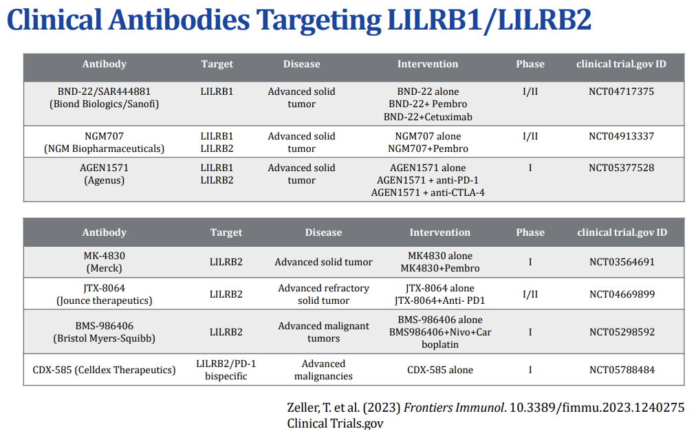 Noita LILRB1 ja LILRB2 targetoivia vasta-aineita on kehitteillä useampia kappaleita.