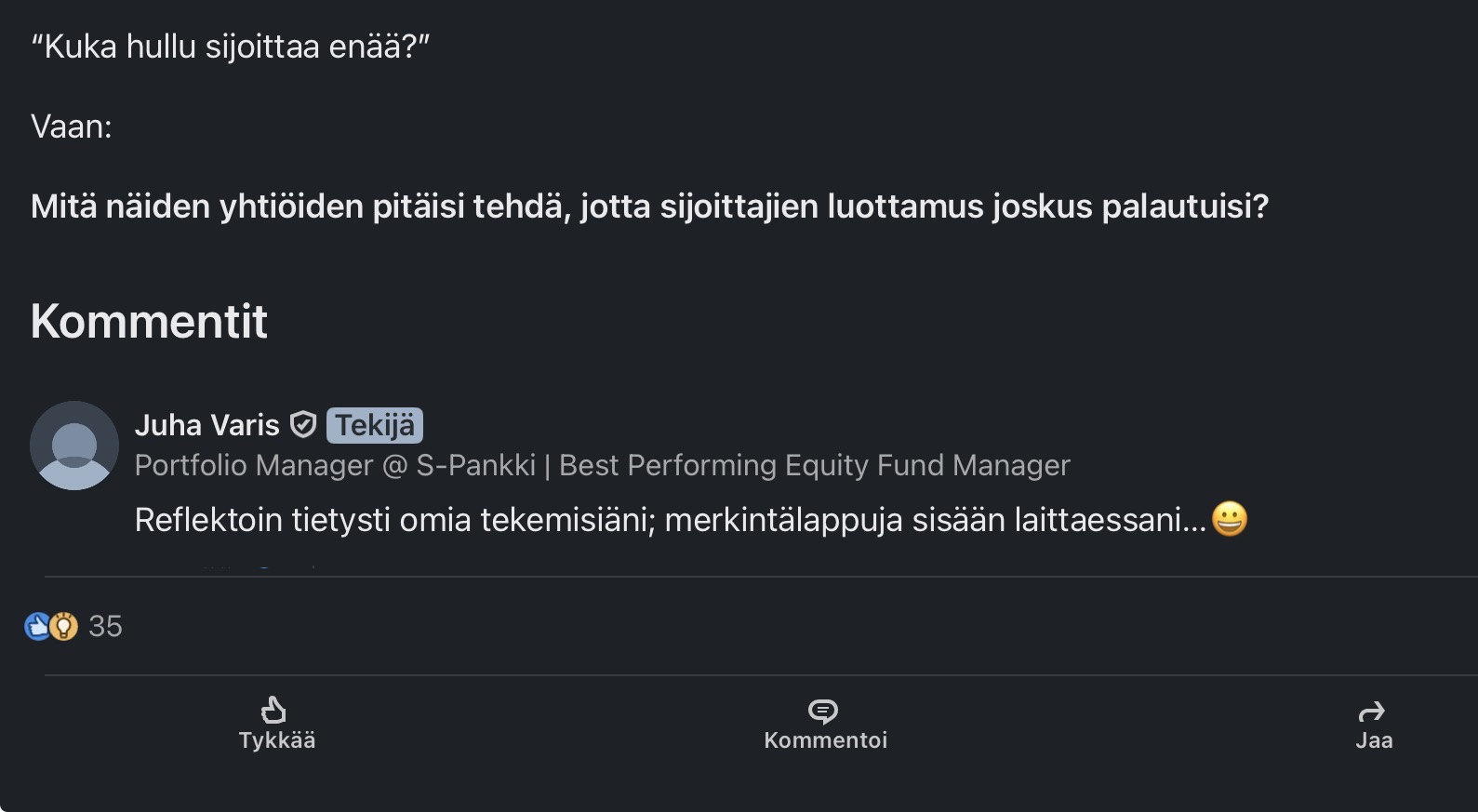 Tällaiset laskelmat ovat hyvin herkkiä virheille ja vääristymille. Nykyisellä markkina-arvolla mitattuna varmasti voi olla “300 miljoonaa tuhottu”, mutta käytännössä tuo argumentti tuskin kestää tarkempaa tarkastelua (saatikka aikaa). Tässä muutamia ajatuksia tästä: