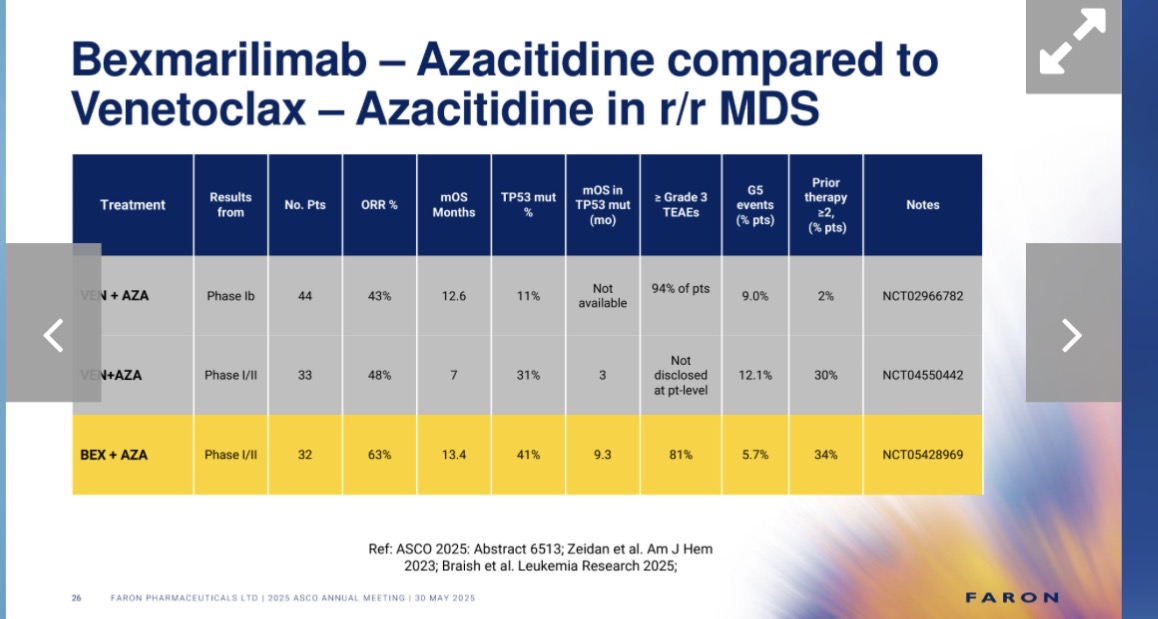 Muuten on mielenkiintoista, että he (tai Zeidan) valitsivat vertailukohteeksi venetoklaksin. Tiedämme kaikki, että venetoklaksin vaiheen 3 kokonaiselossaoloajan (OS) päätepiste jäi saavuttamatta. Mutta tämä viittaa siihen, että kliinikot luultavasti näkevät edelleen arvoa kyseisessä lääkkeessä ja jatkavat sen lisäämistä HMA-hoidon lisäksi MDS:ssä.