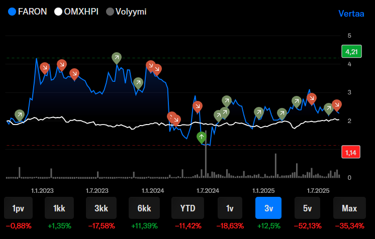 Dette begyndte at interessere mig, og jeg lavede en lille analyse af Inderes’ anbefalingsændringer og deres indvirkning på kursen (i Farons tilfælde). Ved at følge Inderes’ anbefalingsændringer (investoren sælger, når anbefalingen skifter fra køb/tilføj → reducer/sælg og omvendt. Ingen reaktion, hvis den forbliver uændret. Ved køb købes der for samme beløb, som man tidligere solgte for.) har man i perioden 8.8.2022 - 28.8.2025 opnået 214% afkast, hvis man har formået at handle til dagens gennemsnitskurs. Ikke dårligt!