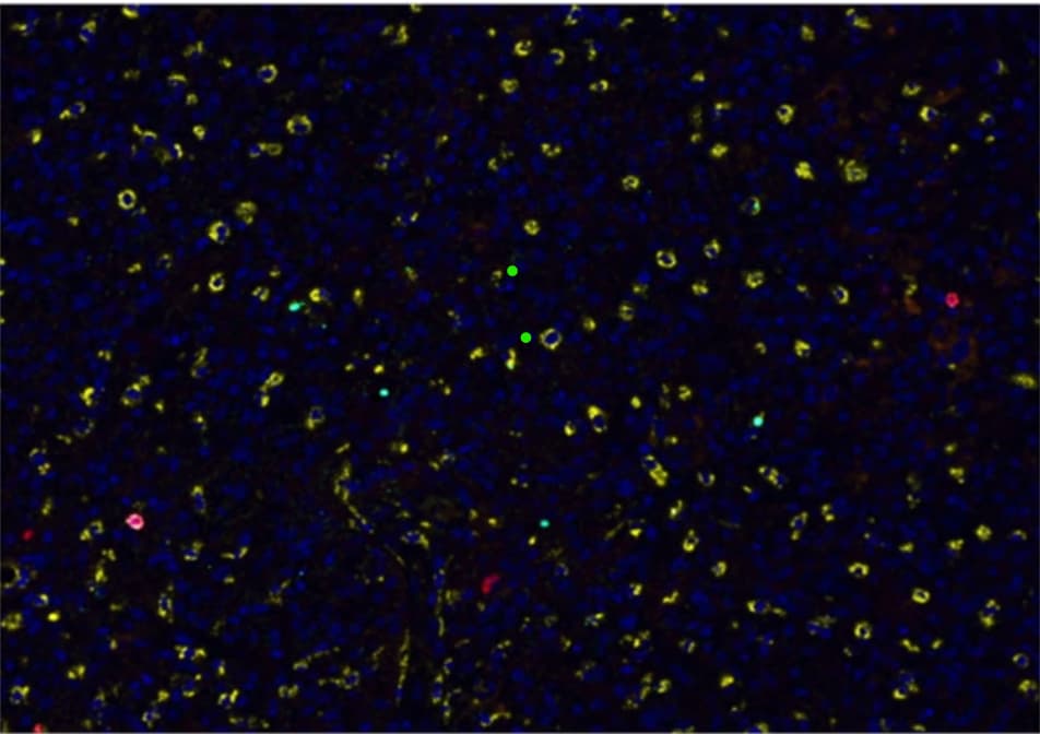 Normaalisti makrofageja ei ole (aivo)kudoksessa mutta syöpä pystyy rekrytoimaan niitä - tässä keltaisena näkyvinä - paikalle suurin joukoin suojaamaan itseään. Punaisella näkyvä harvalukuiset T-solut eivät mahda ylivoimalle mitään yrittäessään tuhota sinisiä syöpäsoluja. Mitä vähemmän näkyy punaisia soluja, sitä kylmempi syöpäsolukko on. Ja sitä myöten lääkkeiden teho heikkenee.