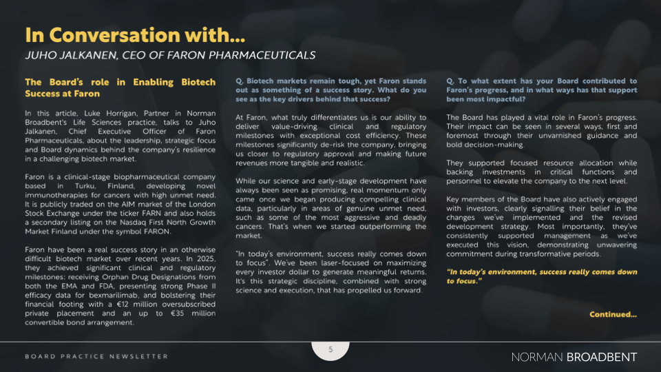 Netop udgivet: Vores seneste kvartalsvise nyhedsbrev fra bestyrelsespraksis – Fremme af vækst inden for biovidenskab. Mercks beslutning i sidste uge om at opgive sit London Discovery Research Centre til 1 milliard pund – engang hyldet som en flagskibsinvestering i Storbritanniens Knowledge Quarter – har sendt chokbølger gennem biovidenskabssektoren og understreger voksende bekymringer om Storbritanniens konkurrenceevne inden for global forskning og udvikling. Dette yderst aktuelle nyhedsbrev udforsker, hvordan bestyrelser i biovidenskabssektoren, både i Storbritannien og internationalt, reagerer på disse modvinde. Fra regulatorisk pres og ustabile investeringsstrømme til den strategiske anvendelse af AI og banebrydende teknologier navigerer bestyrelser i et komplekst landskab af risiko og muligheder. Højdepunkter inkluderer: