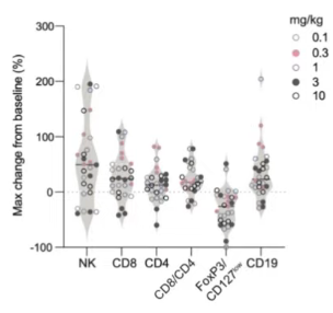Biopsianäytteistä näimme, että vasteen saaneilla potilailla kasvaimeen liittyvät makrofagit (TAM) aktivoituivat, mikä johti korkeampaan interferoni-gamma-tasoon verenkierrossa. Mielenkiintoista oli, että matala lähtötason immuuniaktivaatio ennusti hyötyä bexmarilimabista. Verenkierrossa näimme NK-solujen, CD8- ja CD4-T-solujen sekä B-solujen voimakkaan lisääntymisen, kun taas säätelijä-T-solujen (Treg) määrä väheni.