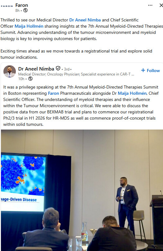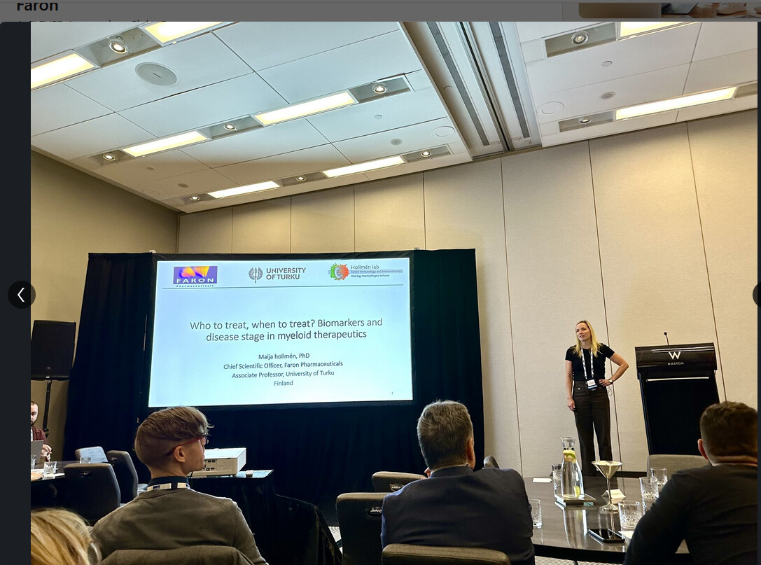 ”Olen erittäin iloinen saadessani olla täällä kertomassa siitä, mitä teemme yliopistolla ja Faron Pharmaceuticalsilla. Kuten mainittiin, toimin Faronin tieteellisenä johtajana (CSO), mutta minulla on myös akateeminen laboratorio Turun yliopistossa. Kuulumme InFLAMES-lippulaivahankkeeseen, jota Suomen Akatemia rahoittaa ja jossa teemme tutkimusta immuniteetista ja siitä, kuinka immuunisoluja voidaan hyödyntää hoidollisesti.