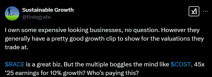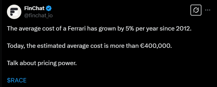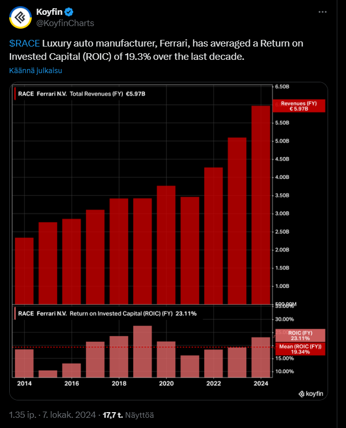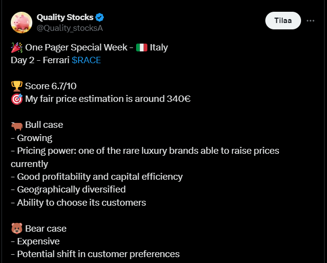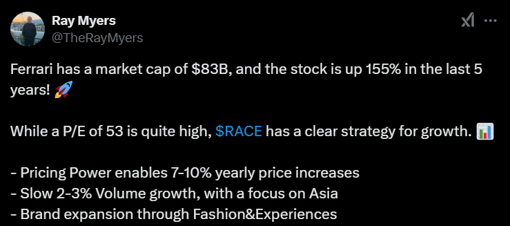 Alla olevassa tviitissä on tuttua teesiä Ferrarista, mutta siinä todetaan jälleen, miten sijoittajat eivät maksa korkeaa hintaa osakkeesta pelkästään lyhyen aikavälin kasvun vuoksi, vaan koska he uskovat Ferrarin brändin, hinnoitteluvoiman ja ainutlaatuisuuden takaavan sille pitkäkestoisen taloudellisen menestyksen.