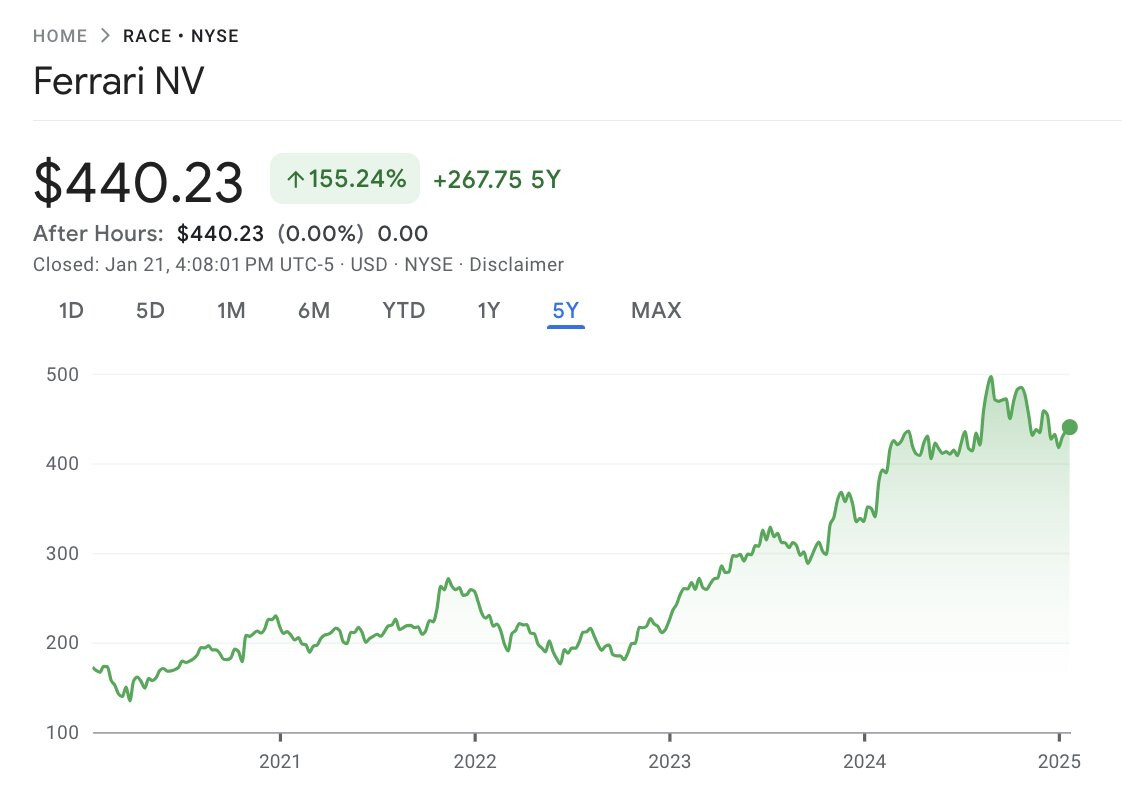 Ymmärrettävästi ja usein on mainittu Ferrarin kalleus, mutta osakkeen kulku on ollut kyllä varsin hyvää. :slight_smile: