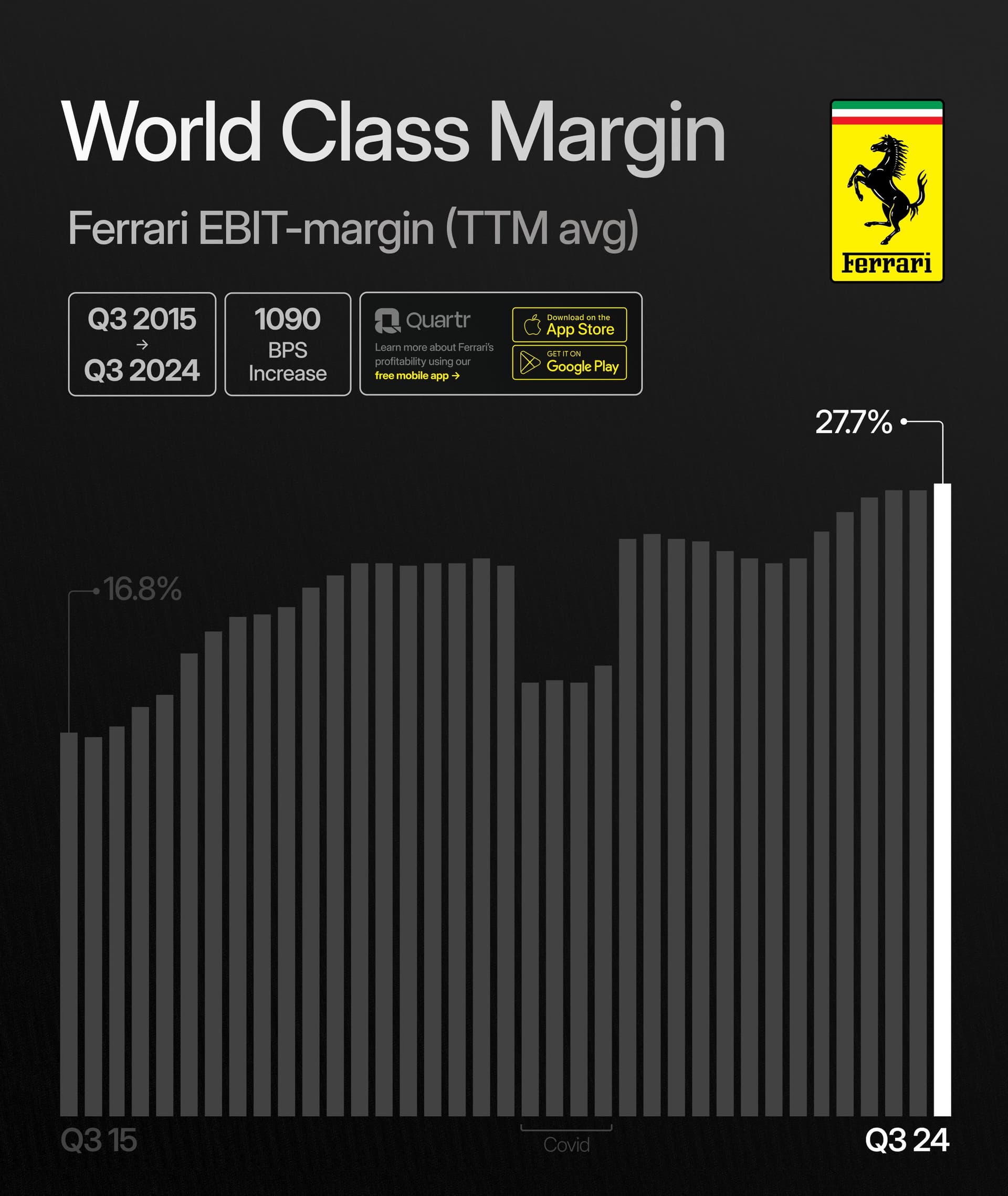 Toisaalta muistutettiin, että yhtiön arvostus on korkea esim. P/E on lähellä viittäkymppiä. Lisäksi on todettu myös, että yhtiö rajoittaa myyntiään säilyttääkseen ainutlaatuisuutensa, joten se hidastaa väkisinkin liikevaihdon kasvua. Toki ainutlaatuisuus on olennainen osa Ferraria. :slight_smile: