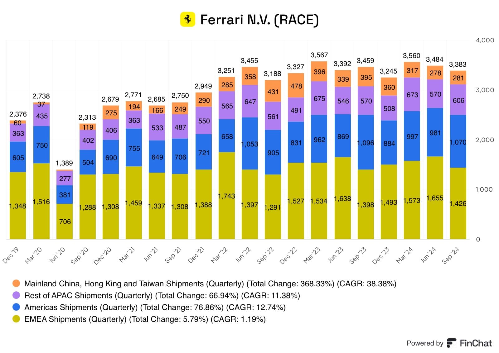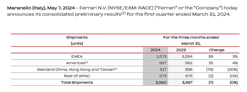 Ferrarin kolmannen vuosineljänneksen toimitukset laskivat 2 prosenttia ja laskun syynä oli 29 prosentin pudotus toimituksissa Kiinaan, jossa Ferrarilla on pienempi markkinaosuus kuin kilpailijoillaan.