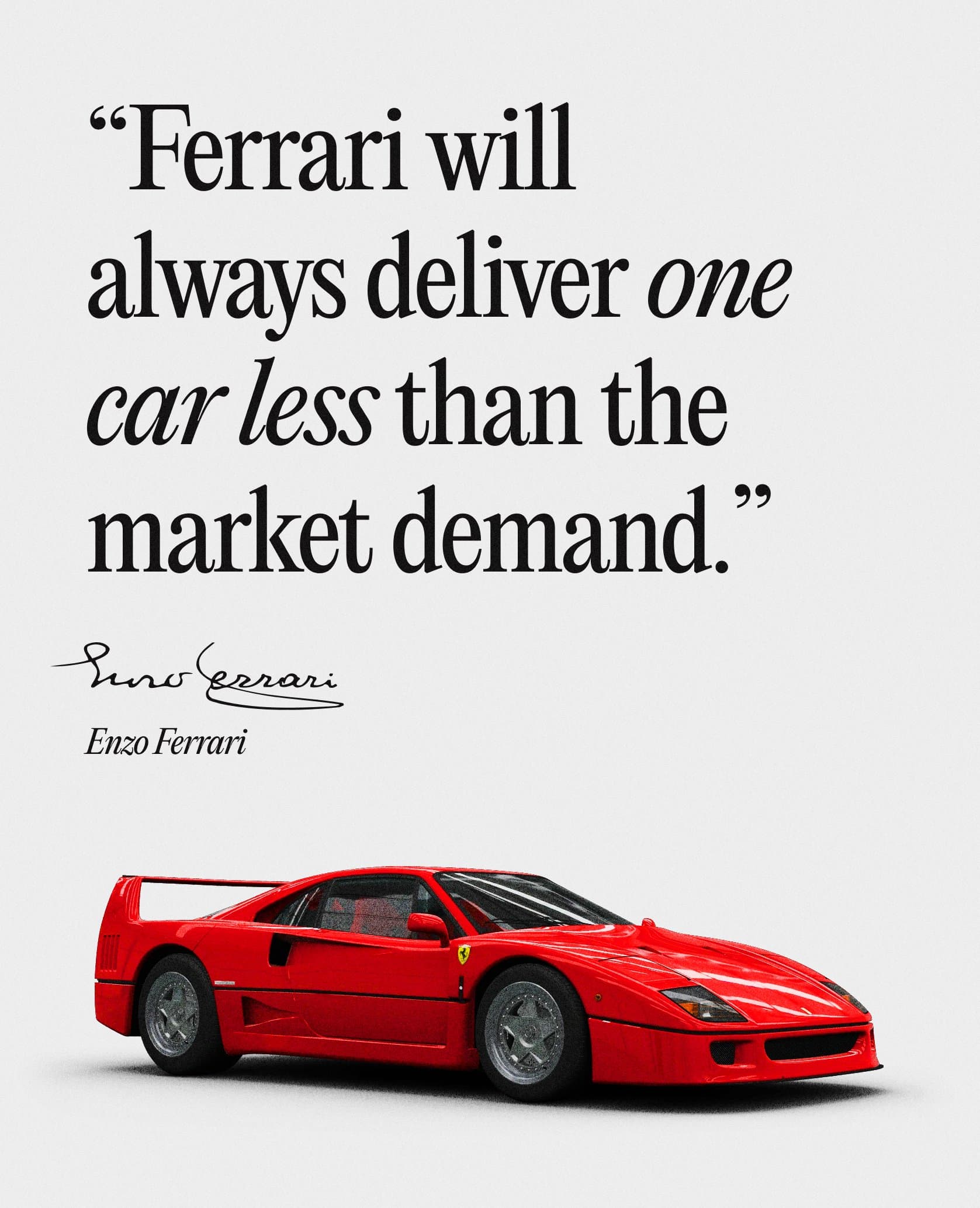 Toistaiseksi Ferrari ei ole vielä lähtenyt kosiskelemaan suuria massoja ja jossain määrin yhtiö valitsee asiakkaansa. Ferrariin liittyy vahvasti huikea historia niin ihan autoissa kuin autourheiluissakin; onhan niitä paljon nopeampia autoja ja innovatiivisempia, mutta Ferrari on Ferrari. Yritys käytännössä tarkoituksella rajoittaa vuosituotantoaan ylläpitääkseen sen hohdokkuutta, että kysyntä ylittää jatkuvasti tarjonnan. Tämä strategia johtaa siihen, että Ferrareilla on aina jälleenmyyntiarvoa sekä varmistaa tietyn luxusuniikkiuden jatkuvuuden ja tämän lisäksi ylläpitää merkin mainetta.
