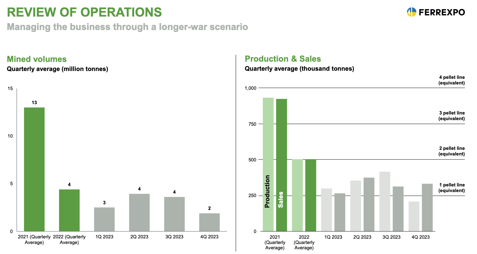 Rautapellettien tuotanto ja myynti on kärsinyt valtavasti Ukrainan sodan vuoksi ja yhtiön neljä pellettilinjaa ovat merkittävällä vajaakäytöllä. Tuotantoa rajoittaa mm. sähkönsaanti, kuljetuskaluston saatavuus, työvoiman saatavuus, työntekijöiden mobilisaatio rintamalle ja työntekijöiden muutto Länsi-Ukrainaan Venäjän läpimurron pelossa.