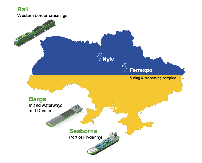 Rautapelletit roudataan kaivosalueelta ulkomaille ensisijaisesti Odessan lähellä sijaitsevasta satamasta, joten merikulkuyhteyksien aukiolo on Ferrexpolle kriittistä. Myös jonkin verran voidaan kuljettaa Tonavan kautta ja rautatieyhteyksien avulla Eurooppaan, mutta Ukrainalla on vain rajallinen määrä raidekapasiteettia ja ilman toimivia meriyhteyksiä tuotantoa joudutaan rajoittamaan valtavasti.