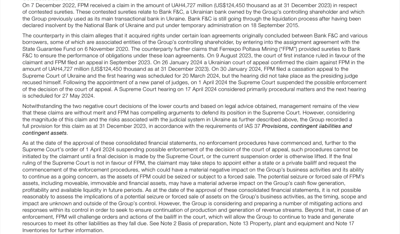 Yhtiön omistuskuvio on jossain määrin sekava. Perustajaoligarkki Kostyantyn Zhevago, joka omistaa firmasta noin puolet, on maanpaossa Ranskassa ja Ukrainan valtion on takavarikoinut hänen omistuksensa vuoden 2022 lopulla. Johtoporrasta on vaihtunut kovaan tahtiin ja entisiä johtajia vastaan on nostettu korruptio- yms. syytteitä siihen tahtiin, että minulle on hieman epäselvää että kuka yhtiön tosiasiallisesti omistaa. Ukraina on varsin korruptoitunut maa, joten tässä on olemassa jonkinasteinen riski yhtiön kansallistamisesta tai rahojen viemisestä.