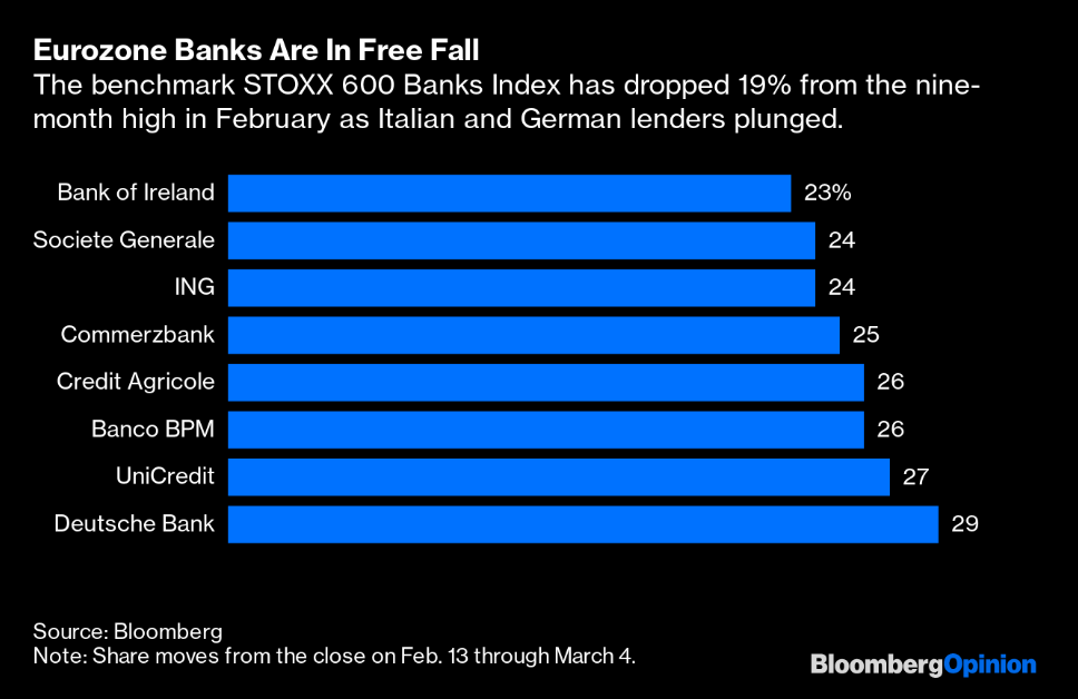 Euroopassa pankkisektori ollut myös paineessa. Italian seisahtuminen koronaviruksen takia nostaa huolet maan velkariskeistä. Muutenkin default-painetta pukkaa yrityksistä pankkien yrityslainoihin, kun bisnekset seisahtuu.