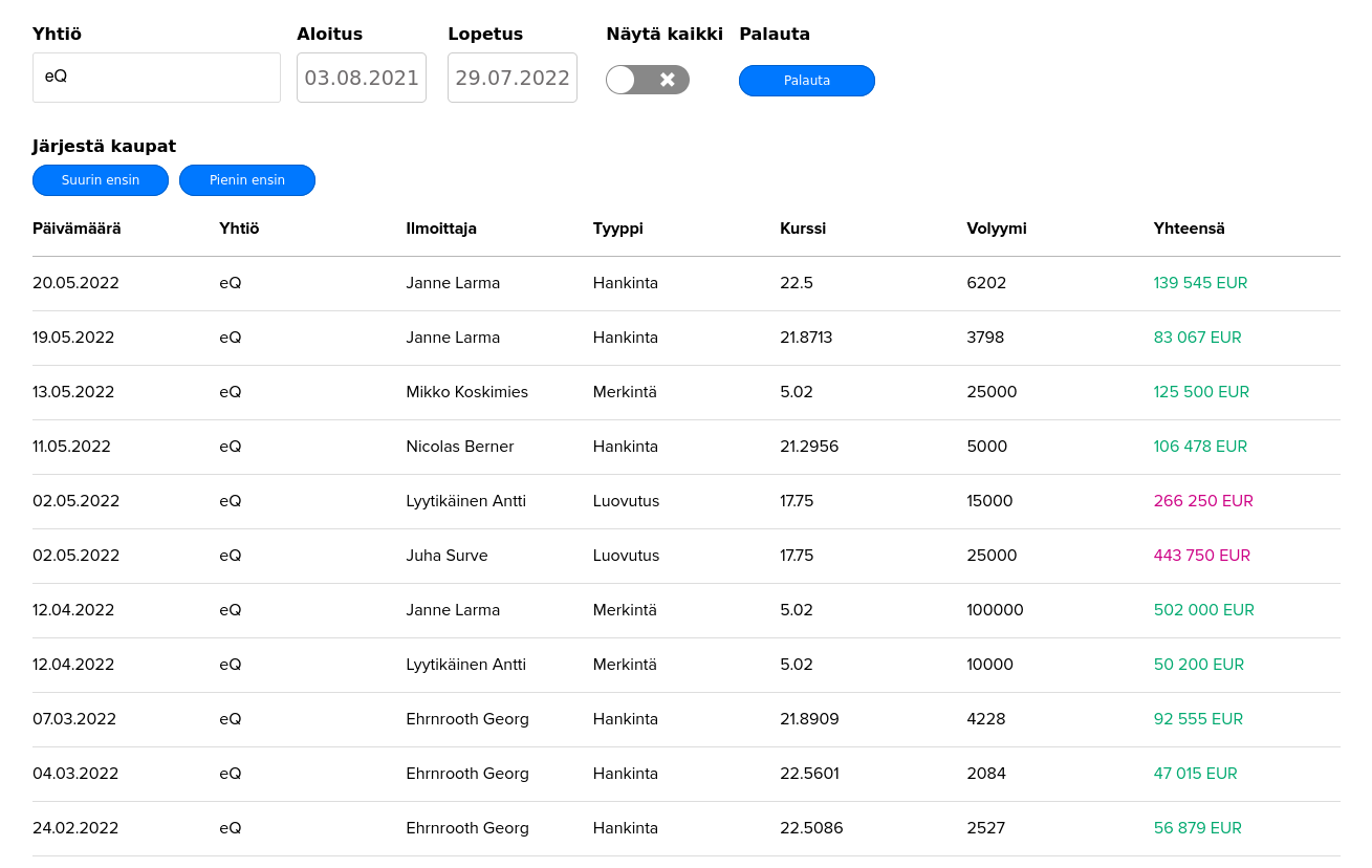 Pidin aiemmin Larman hpj-roolissa tekemiä ostoja merkkinä siitä, että eQ ei olisi käymässä aktiivisia MA-neuvotteluja. Koska eQ’n osake ei enää kesäkuun lopussa ole sisäpiirille kelvannut, lienee mahdollista, että jonkinlaisia tunnusteluja MA-rintamalla onkin käynnissä.