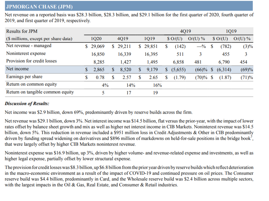 J.P. Morgan CFO Jennifer Piepszak addressed the “base case” by saying that after initially factoring in an annualized 25% GDP decline and 10% unemployment for the second quarter, the bank’s economists had “updated their outlook and now have GDP down 40% in the second quarter and unemployment at 20%,” according to a transcript provided by FactSet.
