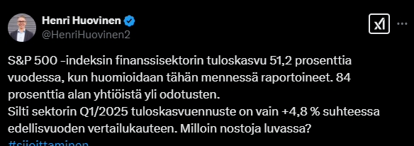 Taitaa korkoympäristö ja -näkymät vaikuttaa tulosnäkymiin myös Atlantin toisella puolella, kuten myös meillä täällä Pohjolassa. Korkokatteesta riippuvaisten yhtiöiden on hankala suurta tuloskasvua tehdä korkojen laskiessa.
