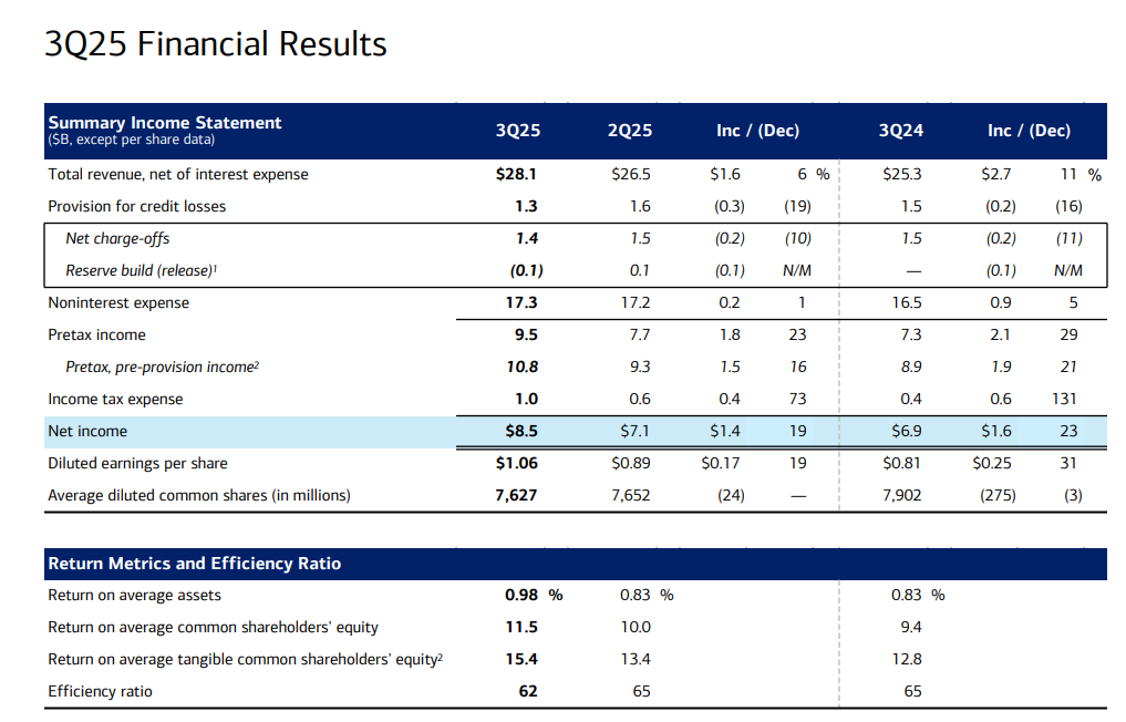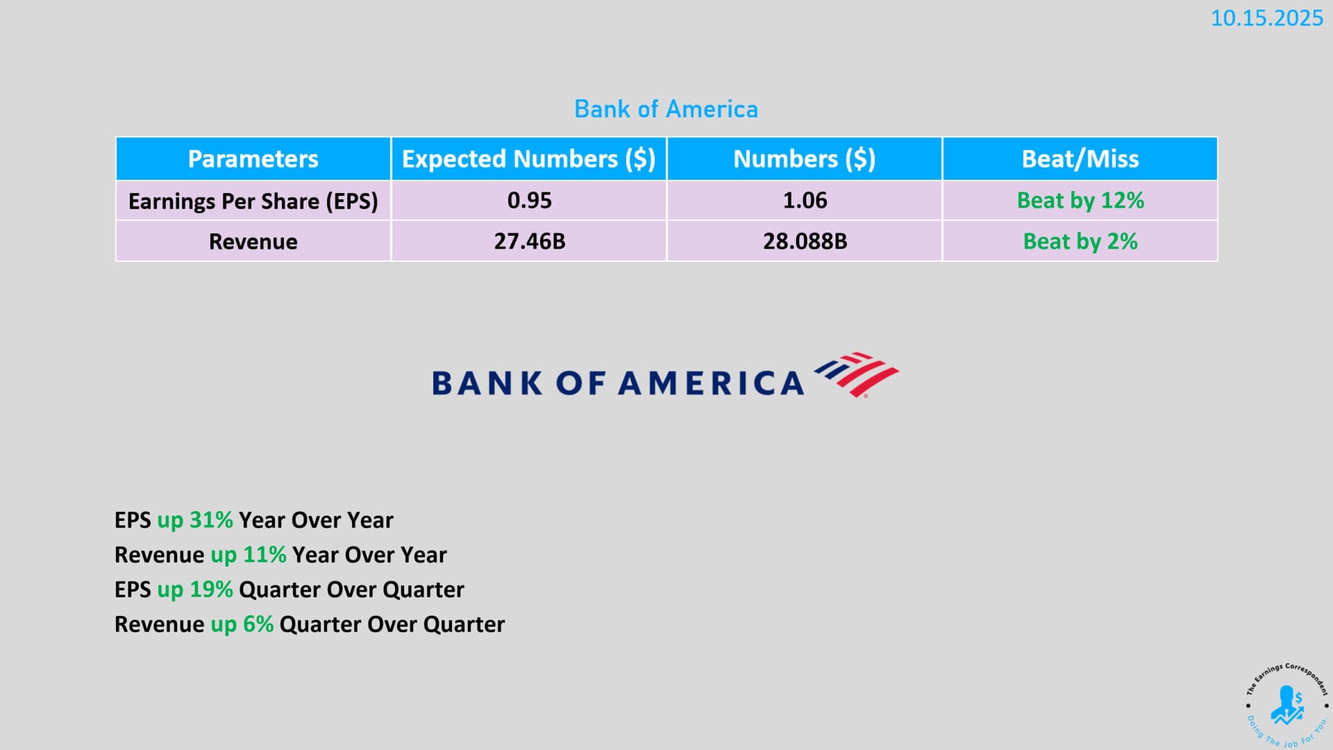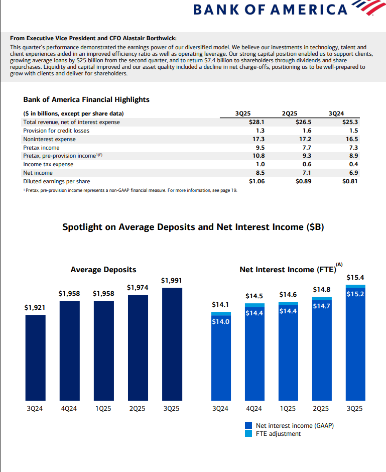 Bank of America teki vahvan tuloksen. Liikevaihto ja voitto kasvoivat reippaasti, erityisesti kuluttaja- ja varainhoitopuolella. Luottotappiot pienenivät ja pankki hyötyi korkeammista koroista sekä myös vilkkaasta kaupankäynnistä. Yhtiön johto korosti teknologia- ja asiakaspanostusten tuottavan tulosta, lisäksi pankki pystyi sekä kasvattamaan lainakantaa että jakamaan runsaasti voittoja omistajilleen.