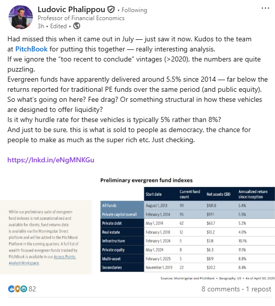 Tiivistetysti, evergreenien tuotot ovat jääneet tosi laihoiksi ja kauas niistä tasoista mitä PE:t ovat tuottaneet suljetuilla rakenteillaan. Tämä ei mielestäni ole mikään yllätys, koska ei PE-markkina tietenkään ole mikään El Dorado, missä jokainen tuote generoi hurjaa alphaa vs. S&P500 huolimatta kuluista yms.