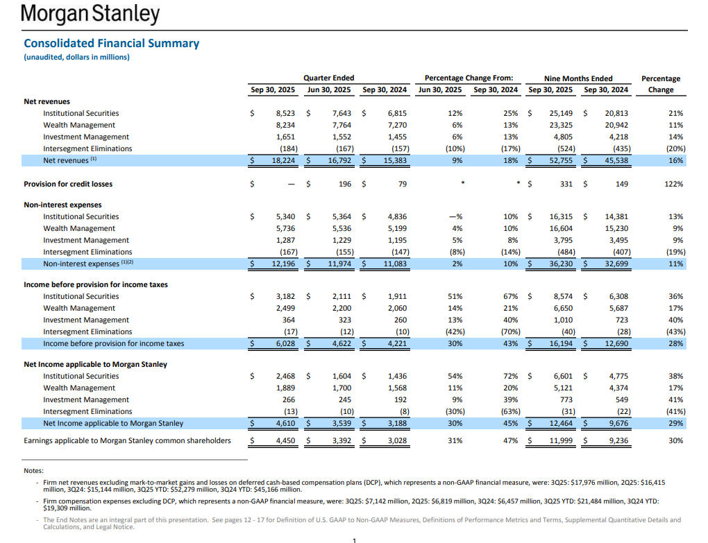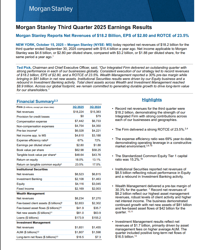 Morgan Stanley teki loistavan tuloksen tällä kvartaalilla ja kaikki sen liiketoiminta-alueet vetivät ilmeisesti hyvin. Varainhoitoon virtasi runsaasti uusia asiakasvaroja ja sijoituspankkitoiminta sekä kaupankäynti kävivät ihan ennätystahtiin.