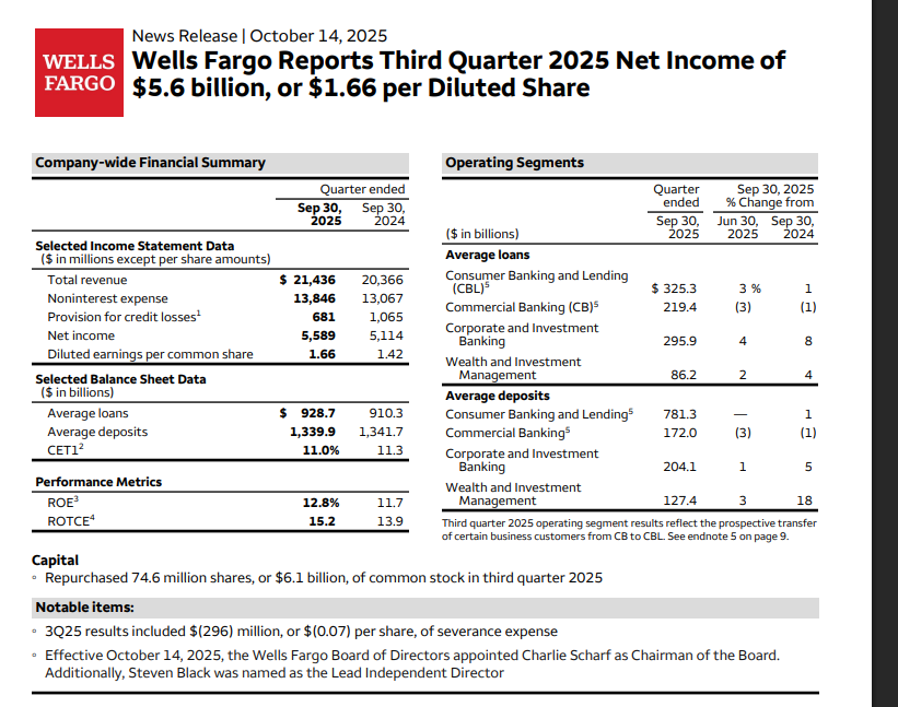 Wells Fargon tulos oli vahva; pankin voitto kasvoi ja liikevaihto nousi laajasti eri liiketoiminnoissa. Asuntolainat ja sijoituspalvelut vetivät hyvin, lisäksi pankki kasvatti taseensa kokoa sekä palautti runsaasti pääomaa omistajilleen osinkoina ja myös osakkeiden takaisinostoina.