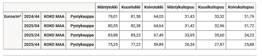 Luken sivuilta katselin puiden kantohinnan kehitystä viimeisen vuoden ajalta: