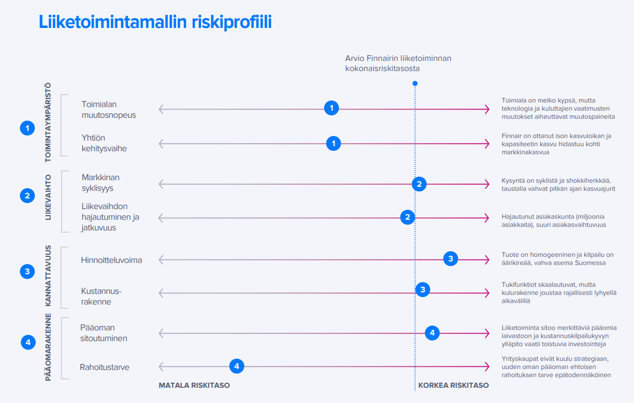 Tiivistettynä: Finnairin vuosien 2020-2025 hidastuvaa kasvua ja kannattavuutta painottava strategia on mielestämme tasapainoinen ja yhtiö esitti CMD:llä uskottavan keinovalikoiman, jolla yksikkötuotot pyritään stabiloimaan ja yksikkökustannuksia laskemaan. Osake on hinnoiteltu mielestämme jo melko pessimistisesti vaisujen lyhyen ajan näkymien mukaan eikä strategian onnistumiselle anneta markkinoilla juurikaan odotusarvoa. Toisaalta Finnairin tasearvostus rajaa jo jossain määrin laskuvaraa, joten odotusarvo lähivuosille alkaa mielestämme olla kohtuullinen, vaikka lyhyellä tähtäimellä riskejä riittääkin.