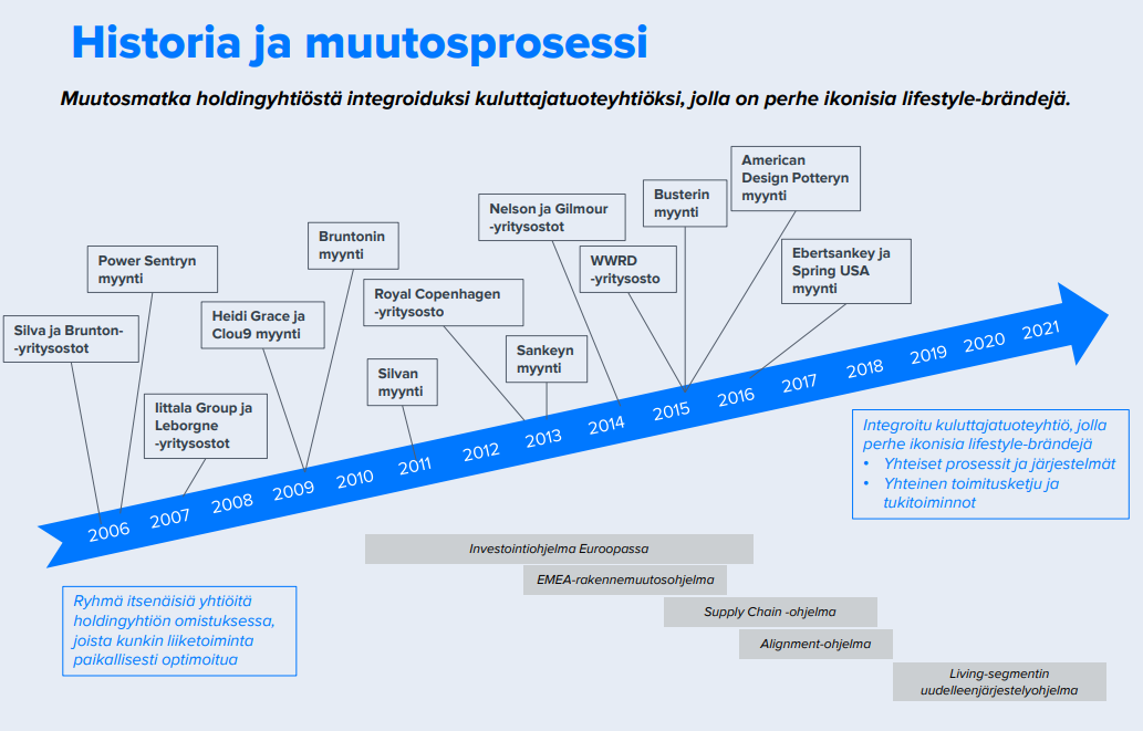 Yhtiöllä on kyllä ollut aikamoinen läjä noita uudelleenjärjestelyohjelmia viimeisen 10 vuoden aikana (Kuva meidän Fiskarsin laajasta raportista 1/2019). Kumma, että koko ajan löytyy vielä kymmeniä miljoonia euroja tehostettavaa organisaatiosta, vaikka tässä ei ole 2010-luvulla ollut yhtäkään päivää, milloin yhtiössä ei olisi ollut jotain rakennemuutos-, uudelleenjärjestely- tai tehostamisohjelmaa päällä. Kai se muutosprosessi holgingyhtiöstä integroiduksi kuluttajatuoteyhtiöksi vie sitten vaan näin paljon aikaa ja lisäksi kuluttajakäyttäytymisen muutos tuo tähän oman haasteensa mukaan.