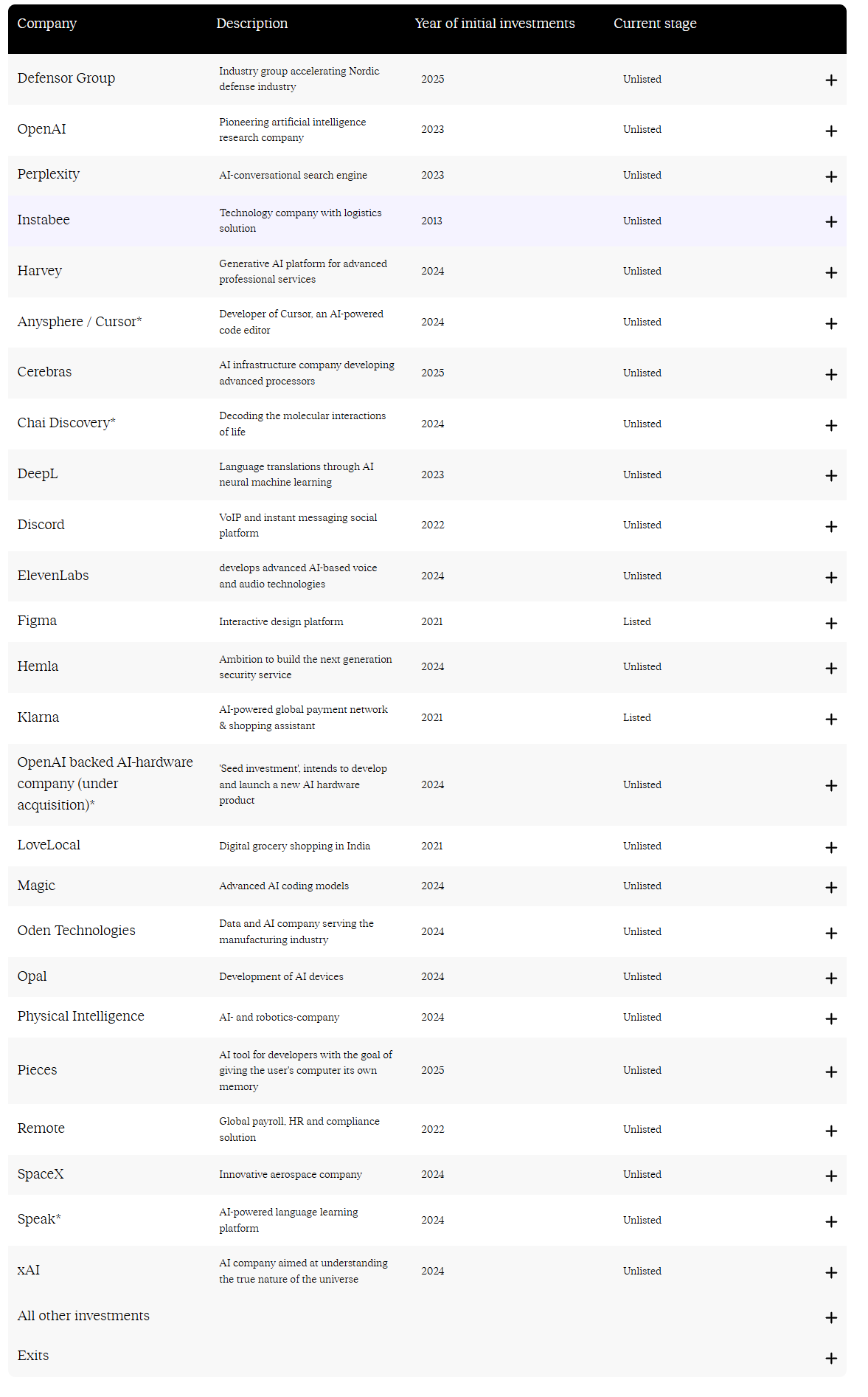 Kyseessä länsinaapurista lähtöisin oleva VC firma, joka sijoittaa pääasiassa listaamattomiin firmoihin. Semmosiin, joihin ei perus mattimeikäläinen kykene. Mielenkiintoisina SpaceX ja vielä hetki sitten listaamaton Klarna. Ja läjä listaamattomia AI firmoja. Seurantaahan firmalla ei ole, Yahoon lähteiden perusteella, Yahoo ist Teil der Yahoo-Markenfamilie. .