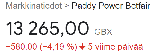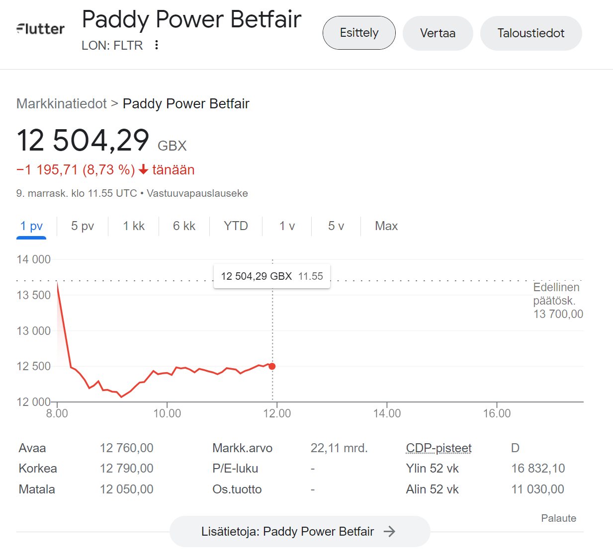 Sijoittajat hermoilee. Lasku johtuu ilmeisesti siitä että Flutter laski vuoden tuotto-odotuksia. Q3-raportti oli omaan silmään kyllä hyvää luettavaa, liikevaihto on hyvässä kasvussa, joskin on vaikeaa erotella orgaanista kasvua ja yritysostoja.