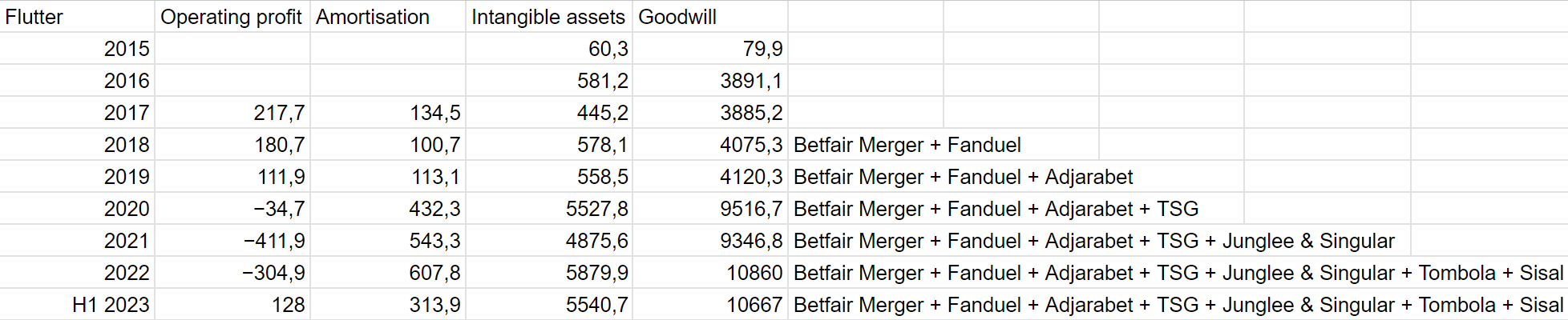 Lähdin tutkimaan vuosiraportteja. 2016 tapahtui Paddy Power + Betfair merge ja siitä lähtien yhtiön aineettomat hyödykkeet (intangible assets) ja niiden poistot ovat kasvaneet. Suurin aineeton hyöty tulee The Stars Groupin ja Sisalin ostoista ja ne ovat taseessa vielä 20 vuotta. Eli siis sijoittajan täytyy katsoa normaalia tulosta eikä adjusted-versiota.