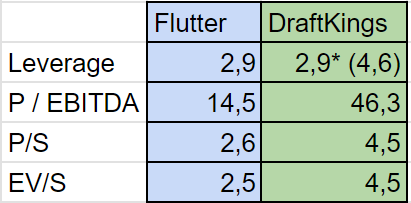 Tein myös pienen vertailun Flutter vs DraftKings. Koska järkeviä nettotuloksia ei olla vielä saatu, vertailin yhtiöiden tarjoamia Adjusted EBITDA lukuja. Flutterilla on varmasti enempi corporate overloadia, mutta melkoisella preemiolla saa ostaa DraftKingsiä. Ja mielestäni tuo preemio on täysin perustelematon, koska Fanduel on se parempi operaattori. Flutter on myös maantieteellisesti hajautettu ja siksi vähemmän riskinen. Luvuissa ei ole mukana DraftKingsin ehdotettua Jackpocket-yritysostoa. Sen jälkeen yhtiön leverage ratio kasvaisi 4.6. DraftKings (yhtiö joka ei ole koskaan tehnyt voittoa) maksoi myös osakepalkkioita 400m dollaria viime vuonna, Flutter hieman alta 200m $.
