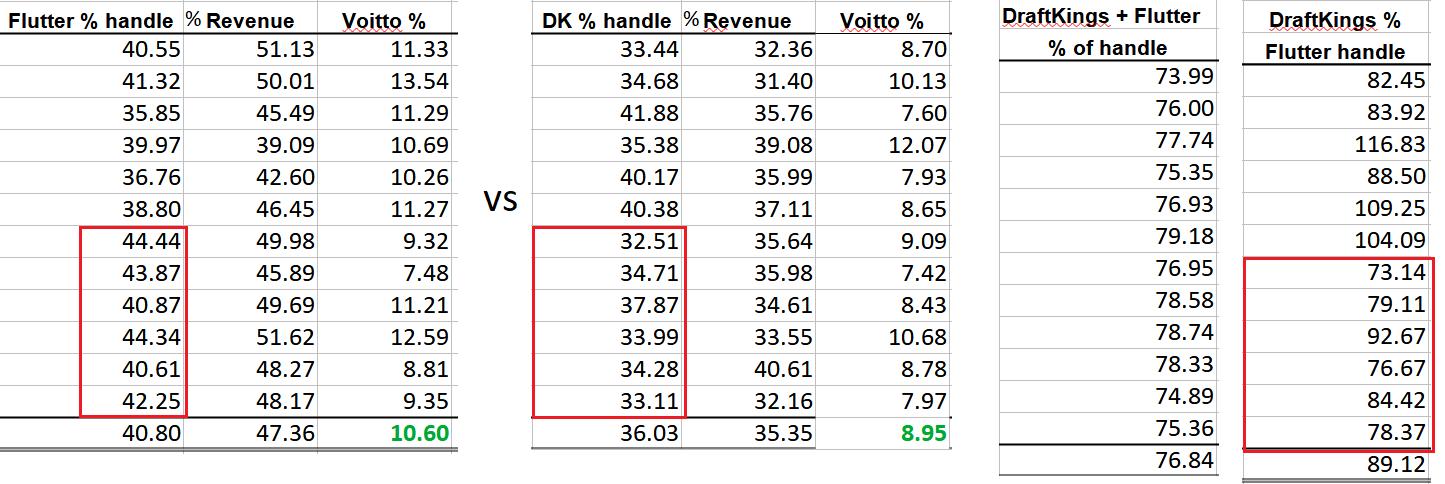Flutter kirjaa siis 40% Nykin handlesta, eli kaikista käsitellyistä vedoista. Flutter kuitenkin kirjaa 47% koko osavaltion liikevaihdosta, eli käytännössä siitä paljonko operaattorille jää käteen käsitellyistä betseistä. Flutterin suorittaminen on aivan omaa luokkaansa tällä saralla ja siksi yhtiö ansaitsisi preemion suhteessa muihin. Voitto % on liikevaihto / handle, joka on myös tärkein suorittamisen mittari.