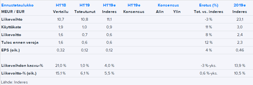 Kokonaisuutena meidän odotusten kaltainen ja vertailukauteen sekä yhtiön historialliseen tasoon nähden heikko raportti. Liikevaihdon kasvu hiipui ja kannattavuutta heikensivät viime vuonna toteutetut huomattavat rekrytoinnit. Huomioitavaa että henkilöstömäärä oli kesäkuun lopussa 163 eli täsmälleen samalla tasolla, kun vuoden 2018 lopussa. Tämän myötä aikaisempiin ennusteisiimme saattaa kohdistua laskupaineita.