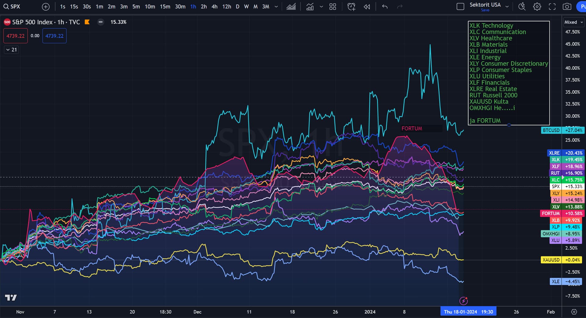 On Friday, October 27, 2023, we saw the latest bottom in the indices. I noted at the beginning of January that Fortum had beaten all US sectors and gold, and by the beginning of the year (Jan 8, 2024), also the real estate sector XLRE and Russell 2000. It had gained a nice +25% since the end of October (and about +37% from the early October bottom), but now only about +10% remains. Once again, nothing could beat Bitcoin, nor has anything beaten it for over ten years.