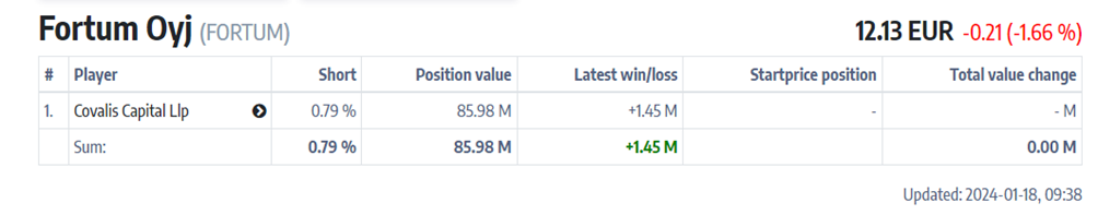 At least Covalis Capital LLP has increased its short position from Jan 15, 2024 (0.56%) → Jan 16, 2024 (0.63%), which creates significant selling pressure for a stock that has risen from its bottom. It is possible the position was increased further today. The upside of short positions is that the rise is also rapid when the positions are eventually closed, as Fortum is unlikely to be played to zero. That is also possible, of course, if Fortum, for example, mistakenly ventures into Germany again.