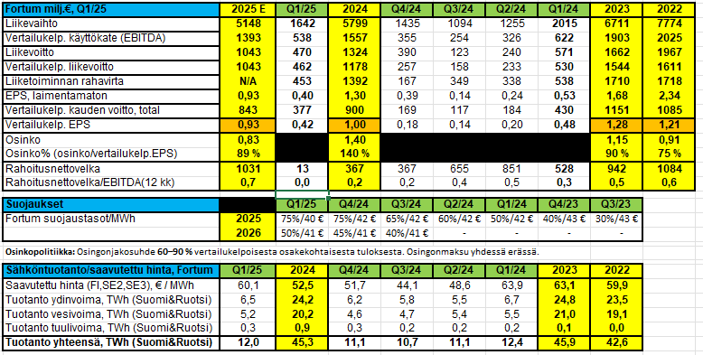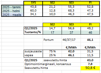Using fuzzy logic, I would say that Q1 is expected to perform quite close to Q4/2024 levels. The achieved price is lower, but production is slightly higher than in Q4. Q1/24 production is significantly smaller when compared to Finland’s total production.